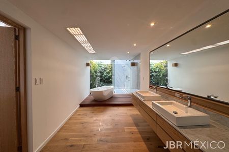 Tiene 240 m2, pisos de madera, en el PB tiene cocina abierta con sala comedor con balcón al exterior, al fondo tiene baño de visitas, un cuarto de tele, y recámara amplia con vestidor y baño completo.